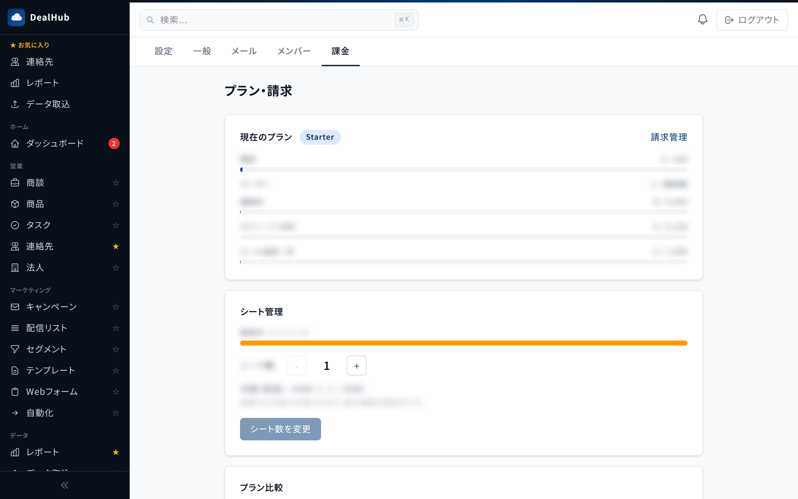 DealHub CRMには4つのプランがあります。「設定」→「課金」タブからプランの確認・変更ができます。