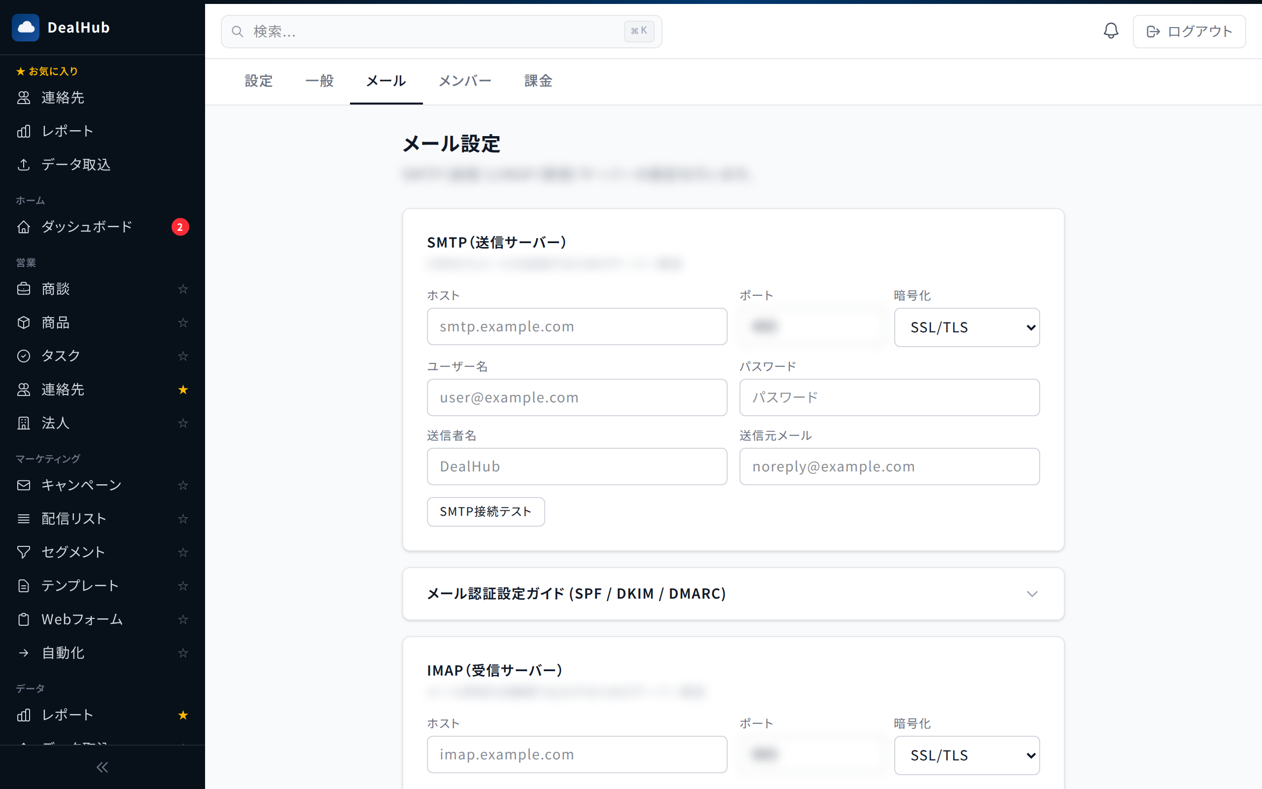 受信メールをDealHubに取り込む場合は、IMAP設定も行います。