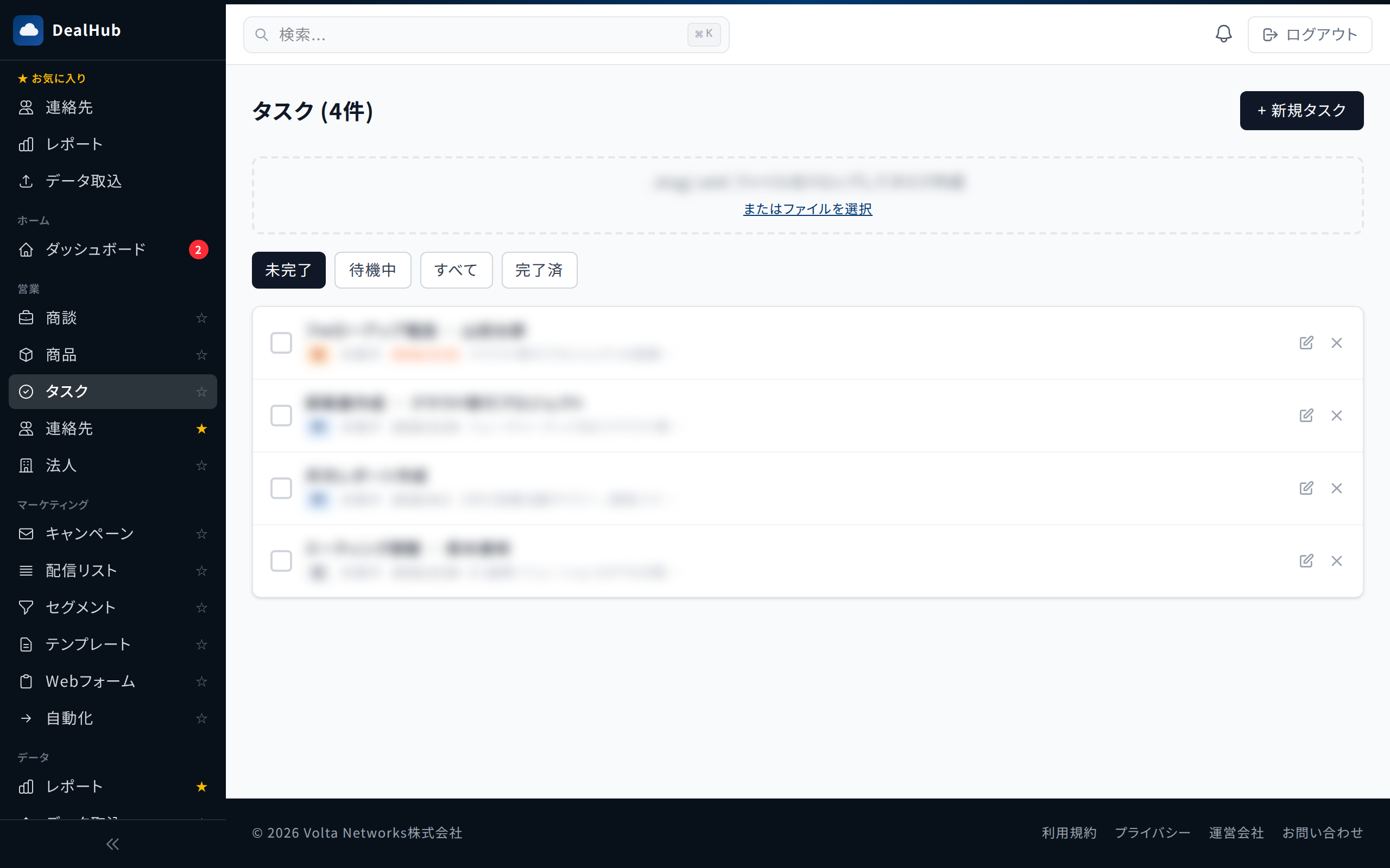 DealHubのタスクは、日々の業務を管理する基本単位です。 「見積書を送付する」「先方に電話する」「契約書を確認する」といった作業を登録し、 ステータスや期日で進捗を把握します。